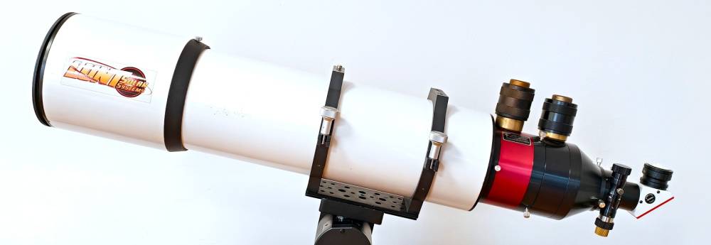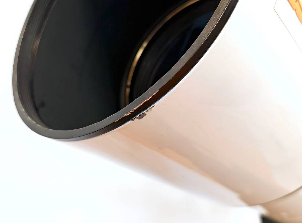 Dalekohled je cca 15 let starý, součástí jsou objímky s 3” lištou Losmandy. Vnější opotřebení odpovídá občasným výjezdům na pozorování.Poškozený závit na rosnici komplikuje našroubování krytu objektivu, ale nemá vliv na funkci samotného dalekohledu.