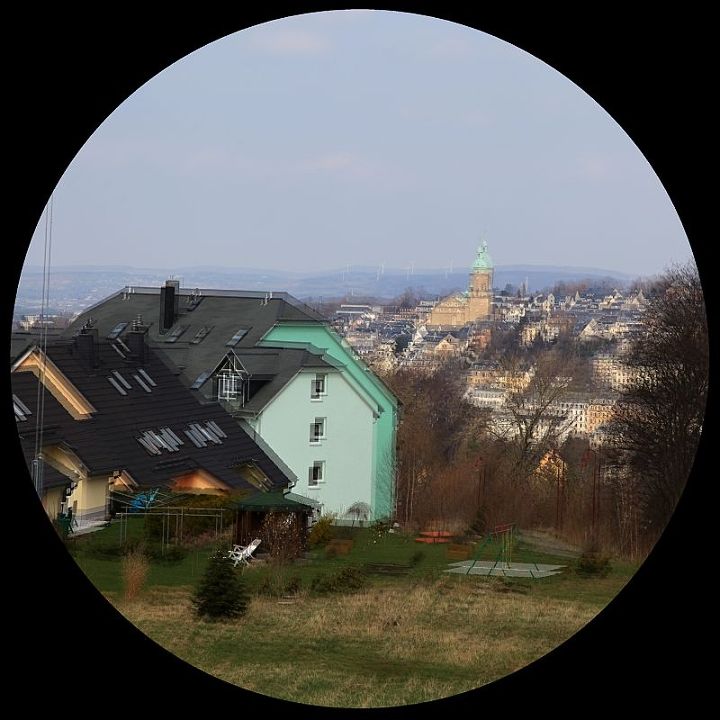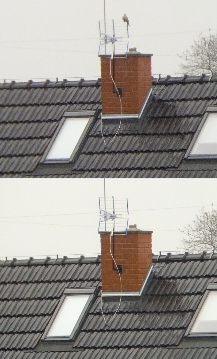 Obr.: Srovnávací snímky za okulárem dalekohledu za zamračeného počasí (malý kontrast). Pro srovnávací snímky byly použity binokuláry jeden nižší střední třídy (tedy ne tržiště :o) a druhý binokulár vyšší třídy stejných parametrů (10x42). Stejné parametry expozice, automatické zaostření na střed komínu, vybrány nejlepší snímky z několika, výřez středu obrázku.